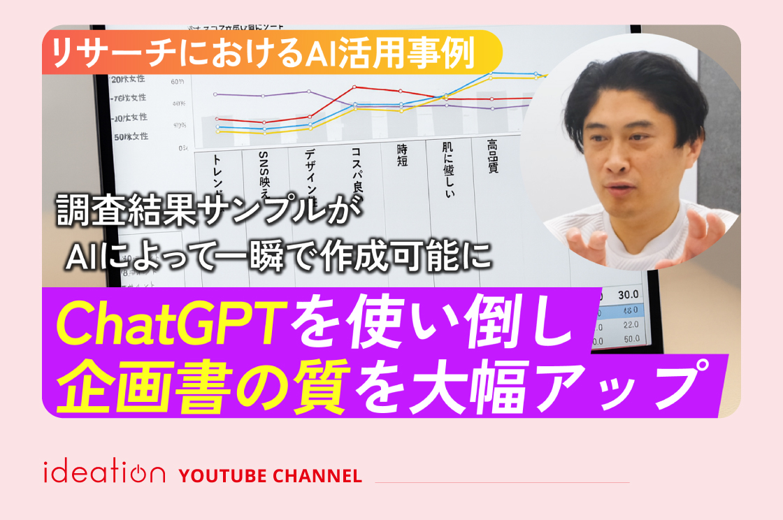 アイディエーションではさまざまなAIツールを積極的に試しながら、リサーチの現場でどのように活かせるのかを日々模索しています。その中で、「この活用法は多くのリサーチャーにとって参考になるはずだ」と感じた具体的な事例を、アイディエーションのYouTubeチャンネルで紹介しています。