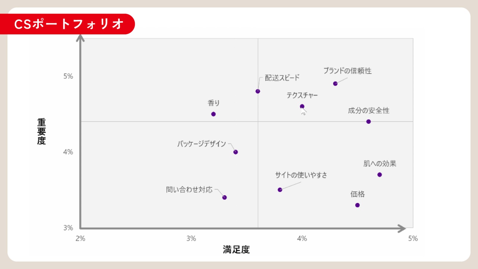 スキンケアブランドの顧客満足度分析の例として、CSポートフォリオを作るためのサンプルデータを作成してください。